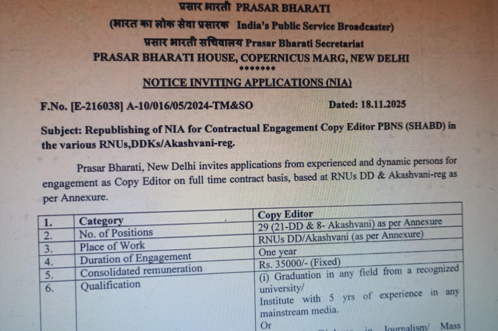 प्रसार भारती ने 29 पदों पर कॉपी एडिटर्स की भर्ती के मांगे आवेदन…जानिए कैसे होगा सिलेक्शन?