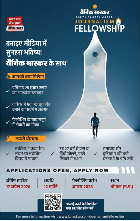 नई दिल्ली. करियर डेस्क भारत के प्रमुख मीडिया समूहों में से एक दैनिक भास्कर का जर्नलिज़्म फेलोशिप प्रोग्राम युवा और उभरते पत्रकारों के लिए एक महत्वपूर्ण पहल है। इस फेलोशिप का उद्देश्य देशभर के प्रतिभाशाली युवाओं को निष्पक्ष और जनहित की पत्रकारिता के लिए प्रोत्साहित करना है। इस फेलोशिप के माध्यम