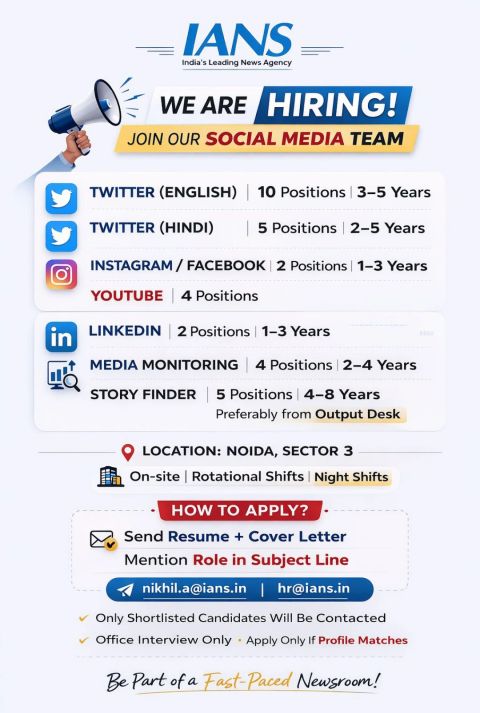 नई दिल्ली। करियर डेस्क देश की अग्रणी समाचार एजेंसी IANS (इंडो-एशियन न्यूज सर्विस) ने अपने सोशल मीडिया विभाग के विस्तार के लिए विभिन्न पदों पर भर्ती की घोषणा की है। एजेंसी द्वारा जारी आधिकारिक सूचना के अनुसार, डिजिटल प्लेटफॉर्म पर बढ़ती सक्रियता और कंटेंट की मांग को देखते हुए यह