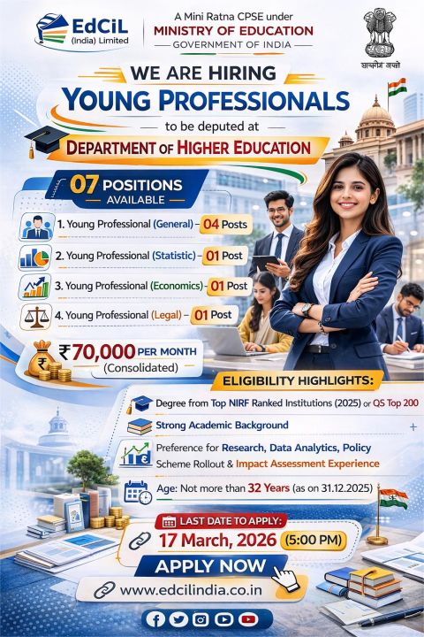 नई दिल्ली. करियर डेस्क EdCIL (India) Limited एक मिनी रत्न कंपनी है जो कि एजुकेशन मिनिस्ट्री के अंतर्गत करते हैं। इस कंपनी ने यंग प्रोफेशनल्स की वैकेंसी हॉयर एजुकेशन डिपार्टमेंट में की जाएगी। यह अवसर यंग प्रोफेशनल्स को भारत के एजुकेशन तंत्र में नीतिगत और संस्थागत सुधारों में योगदान देने