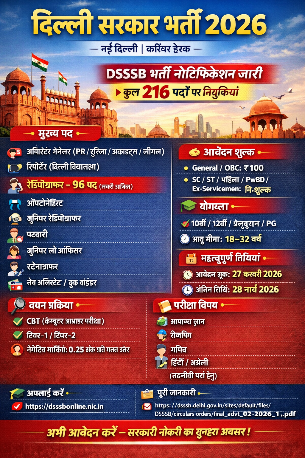 नई दिल्ली। करियर डेस्क दिल्ली सरकार के तहत Delhi Subordinate Services Selection Board ने वर्ष 2026 के लिए नई भर्ती का नोटिफिकेशन जारी किया है। इस भर्ती अभियान के तहत विभिन्न विभागों में कुल 216 पदों पर नियुक्तियां की जाएंगी। पदों का विवरण इस भर्ती के तहत विभिन्न विभागों में