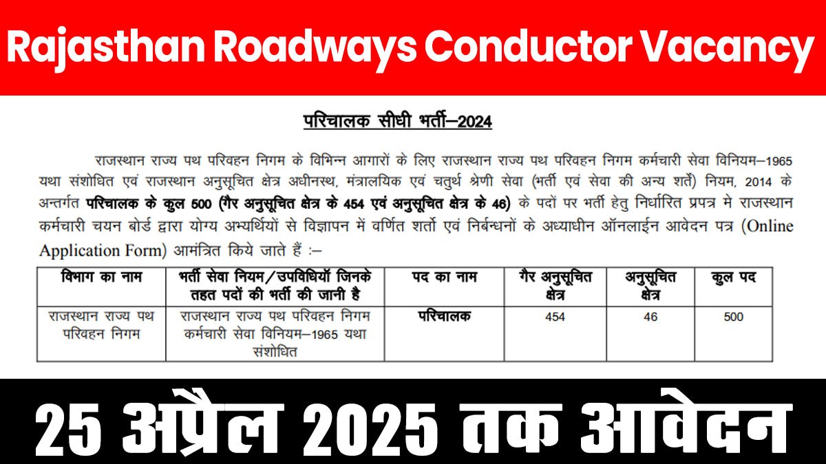 जयपुर. राजस्थान कर्मचारी चयन बोर्ड ने रोडवेज में कंडक्टरों की भर्ती का नोटिफिकेशन जारी किया है. इसके लिए कम से कम 10वीं पास होना चाहिए. इसके अलावा वैलिड ड्राइविंग लाइसेंस भी होना चाहिए.