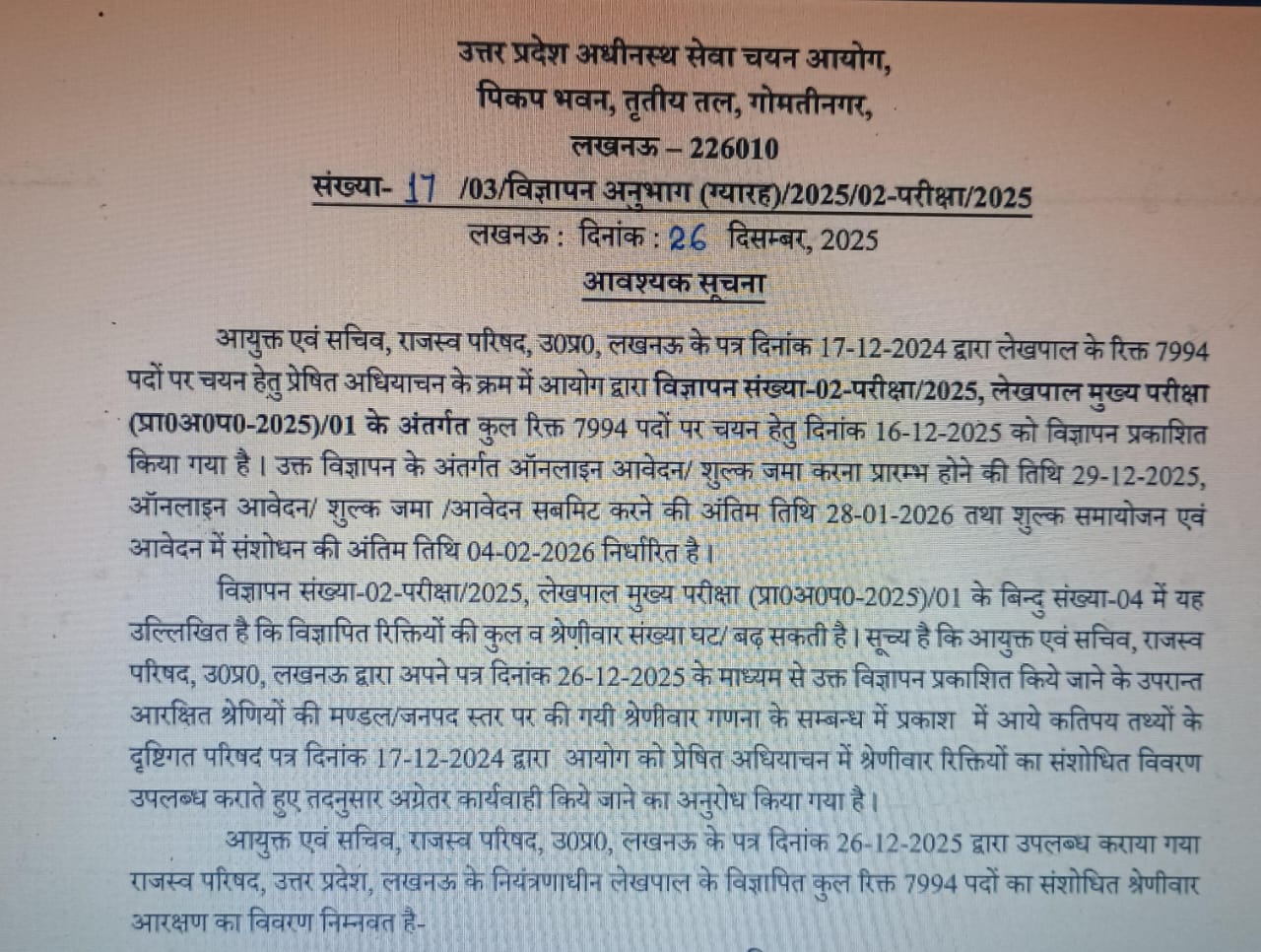 यूपी में लेखपाल के 7,994 पदों पर भर्ती के लिए नोटिफिकेशन जारी…जानिए कैसे करें अप्लाई? December 29, 2025 No Comments