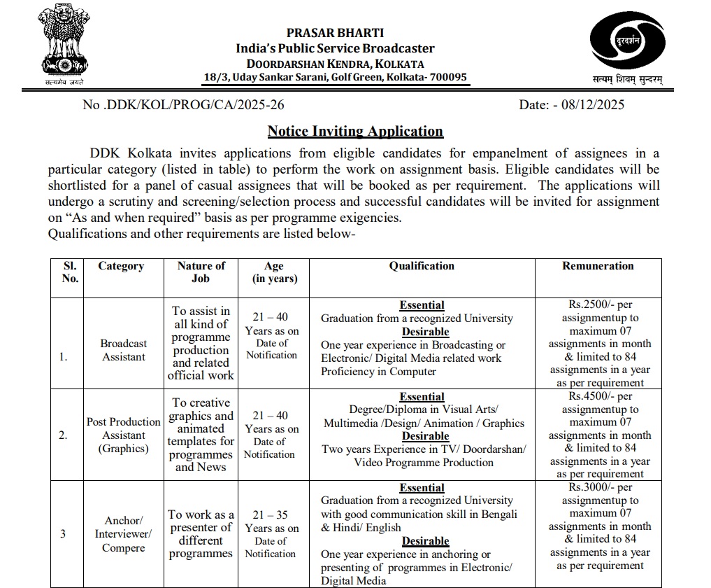 कोलकाता। प्रसार भारती ने कोलकाता दूरदर्शन में काम करने के लिए इच्छुक और योग्य उम्मीदवारों से आवेदन आमंत्रित किए हैं। चयनित उम्मीदवारों को कैजुअल असाइनमेंट बेसिस पर कार्य करना होगा। आइए जानते हैं किन किन पदों के लिए वैकेंसी निकली है